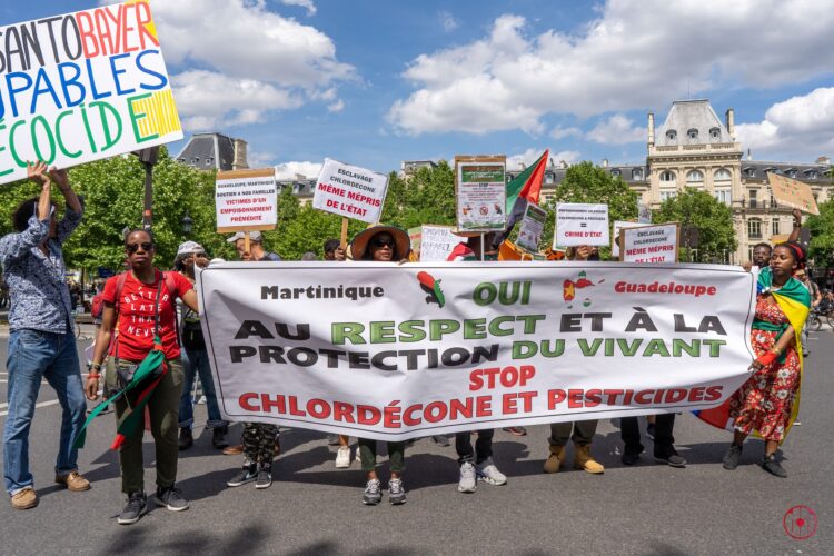 Xavier Dolmen est membre du COAADEP, le Collectif des Ouvriers Agricoles et de leurs Ayant Droits Empoisonnés par les Pesticides, et étudiant en master 2 de Sciences sociales. Lors d’un travail de recherche sur la santé en Martinique, il rencontre des personnes membres du collectif des ouvriers et ouvrières agricoles. « C’est comme ça que j’ai rejoint la lutte. » Lui-même originaire de Martinique, il affirme être « particulièrement sensible à ce combat », dont il n’avait pas connaissance jusqu’ici, ayant grandi en Hexagone. Le COAADEP est né en 2019, à l’initiative de Josette Bomaré et Gisèle Gros, les deux ouvrières agricoles martiniquaises ayant survécu à la répression sanglante de la tuerie du Chalvet du 14 Février 1974 dont nous parlions plus haut. « Une partie de nos membres ont participé à la grève de 1974 », explique Xavier Dolmen. « Le COAADEP compte une centaine de membres, répartis en Martinique et en Hexagone. Nos membres vivant en Martinique sont plutôt âgés. » Si la Martinique et la Guadeloupe partagent un certain pan de l’Histoire, la domination béké ne s’y est pas déployée de la même manière. « En Martinique, ils sont beaucoup plus présents et bien plus puissants« , affirme Xavier Dolmen. « Dans les Antilles françaises, quand la traite négrière fut interdite, les colons de Martinique se sont alliés avec les néerlandais qui possédaient l’île et ont pu, ainsi, échapper à l’abolition de l’esclavage. Des planteurs guadeloupéens se sont alors réfugiés en Martinique. » Reconnaissance, réparation et indemnisation : tels sont les objectifs du COAADEP si on les résument en trois grands mots. La question de la reconnaissance est vaste. Il s’agit d’abord d’obtenir celle de l’État français, de la justice et des grands planteurs, de l’empoisonnement massif au chlordécone des Martiniquais-es et des Guadeloupéen-nes, ainsi que de leur responsabilité. Mais c’est aussi la reconnaissance d’autres maladies liées à cet insecticide, ce qui implique de poursuivre la recherche sur d’autres pathologies, telles que le cancer du sein ou l’endométriose. « On sait que le chlordécone est un perturbateur endocrinien. Sur la santé des femmes et celle des enfants, il y a un vrai flou autour des pathologies, d’autant plus qu’on ne prend pas en compte les effets cocktails. Car non seulement le chlordécone a été massivement utilisé, à mains nues, par les ouvrières, mais ce fut aussi le cas pour l’ensemble des autres pesticides utilisés à l’époque, comme le Paraquat, le Mocap… » Réparation ensuite, par la dépollution des sols et la réhabilitation des terres contaminées.