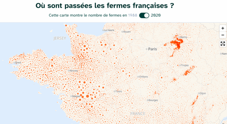 Autre symptôme de cette désertification des zones rurales : la disparition des fermes au profit des plus grosses exploitations agricoles, spécialisées en élevage intensif. Aleksandra, la trentaine, suit elle aussi une formation pour devenir paysanne. À la barre, elle s’appuie sur l’enquête 2023 sur la structure des exploitations agricoles, qui indique que 40 000 fermes françaises ont disparu en seulement 3 ans et, avec elles, la capacité des villes et villages à produire une alimentation locale et de qualité. « On ne pourra pas s’en sortir qu’avec des grosses fermes ! Personne n’a envie d’avoir un pays sans oiseaux ni eau potable. En contaminant l’eau et les sols, on contamine nos corps et notre avenir ! » L’enquête citée ci-dessus révèle également qu’en Bretagne, trois quarts des fermes ont disparu depuis 1988. À ce sujet, la cartographie réalisée par la plateforme Territoires Fertiles et l’association Terre de Liens est édifiante : elle montre le nombre de fermes sur le territoire français en 1988, versus 2020.